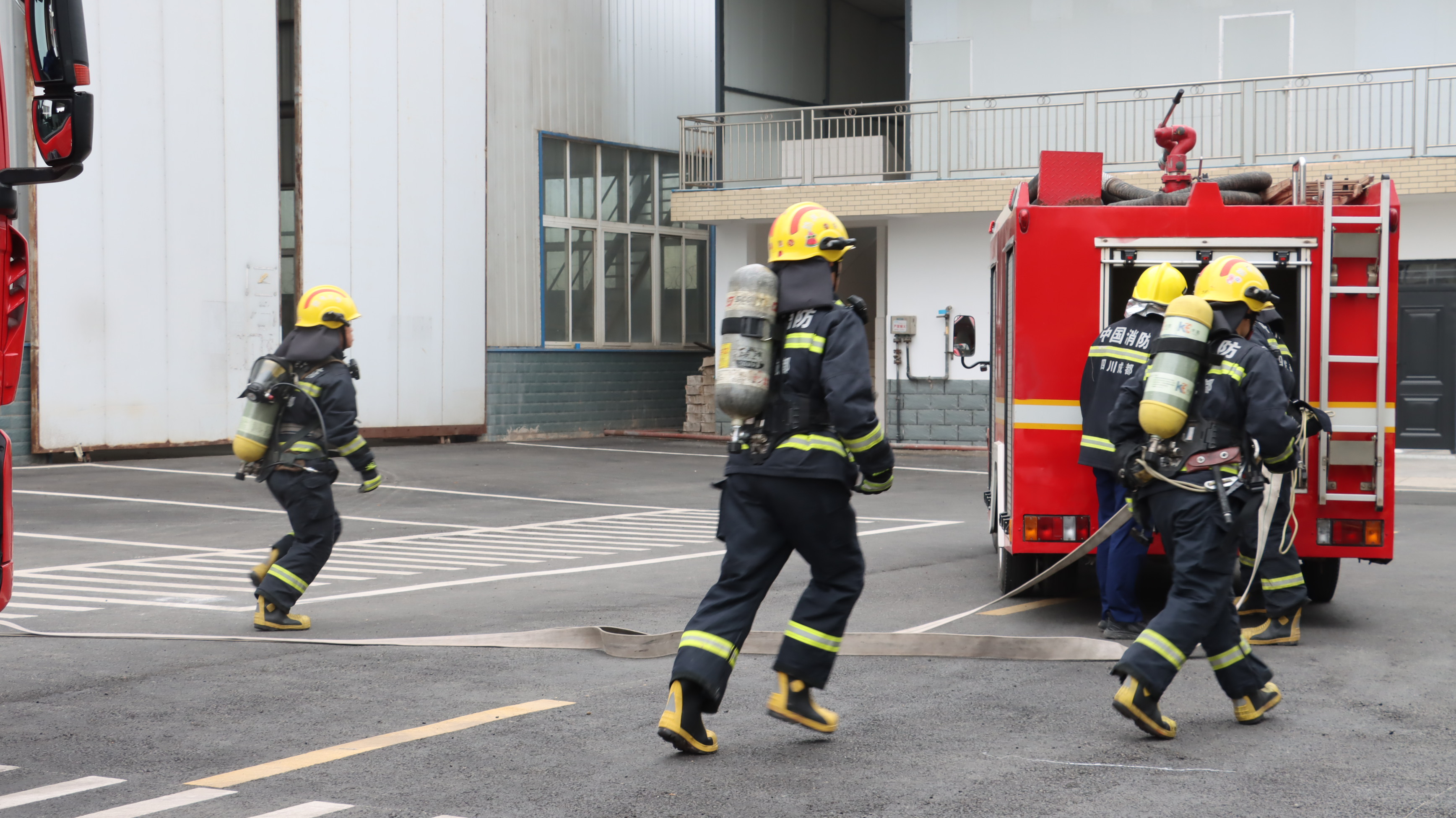 3.滅火實(shí)操:滅火組成員迅速穿戴裝備,使用干粉滅火器等設(shè)備撲滅初期火源。