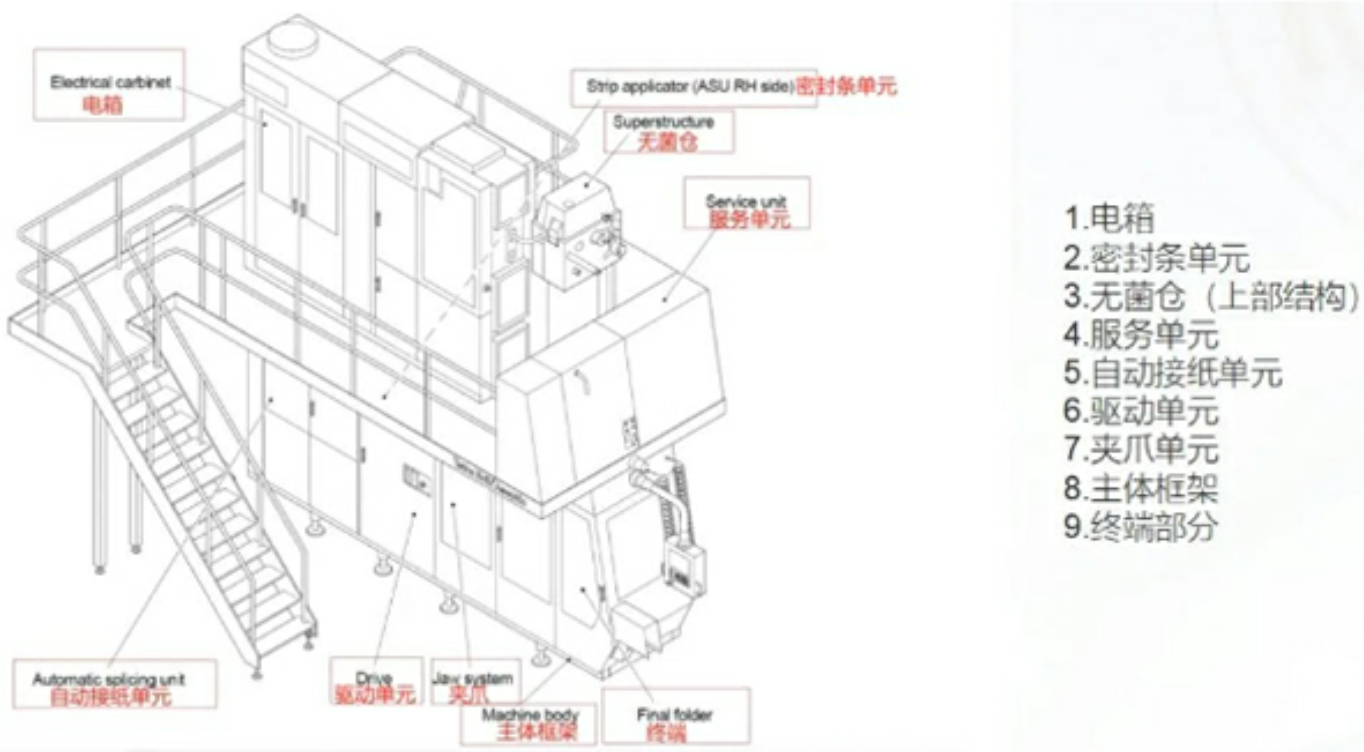 包材滅菌的場(chǎng)所,所有用于灌裝的包材都會(huì)在無(wú)菌倉(cāng)里過(guò)一下雙氧水倉(cāng),出來(lái)后擠壓輪會(huì)刮掉大部分的雙氧水,殘留部分會(huì)通過(guò)加熱給蒸發(fā)掉。
